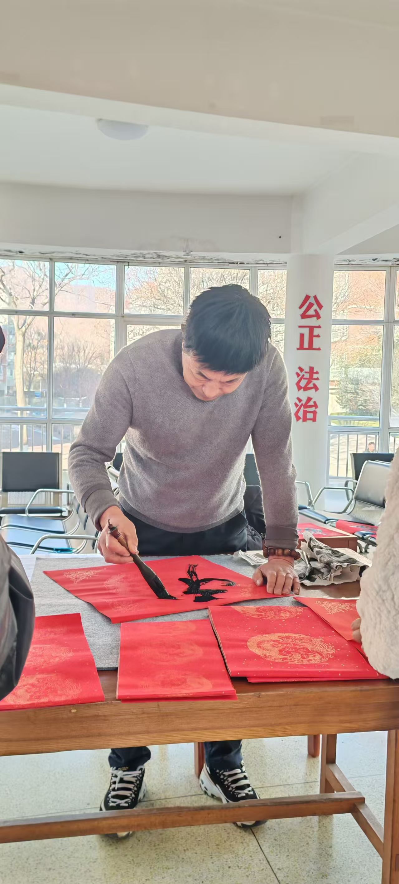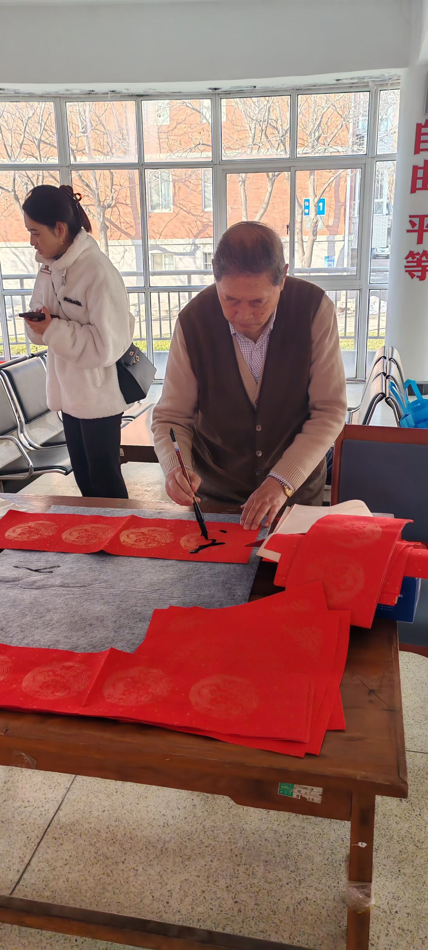 活动现场暖意融融,大红宣纸整齐铺展,我校离退休书法爱好者联袂挥毫,楷书端庄规整,行书流畅洒脱。一个个大大福字、一幅幅定制联句,既契合马年“开拓进取”的精神内核,又饱含对喜乐安康的美好祝愿。